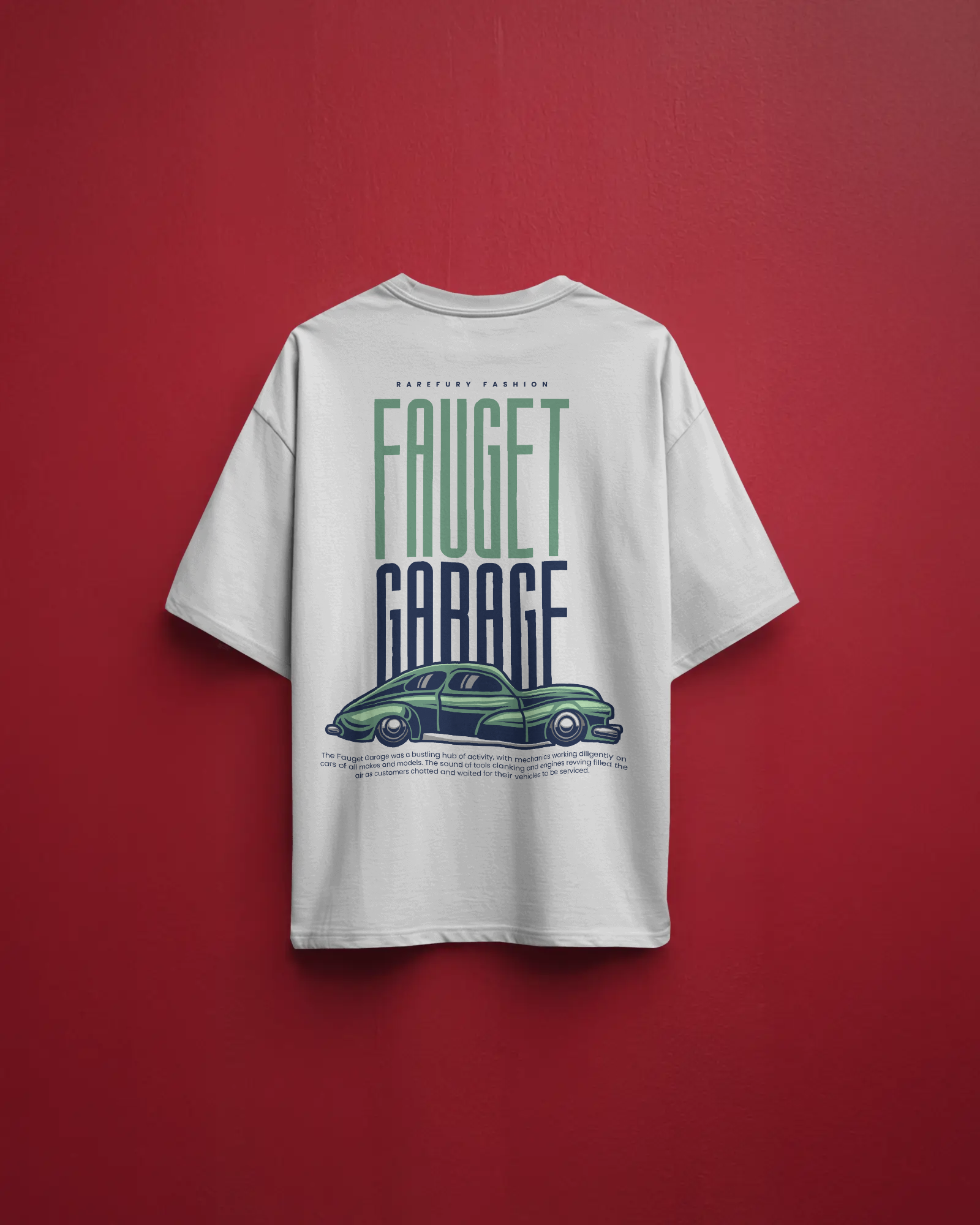 - Bold “Faucet Garage” vintage car artwork on the back