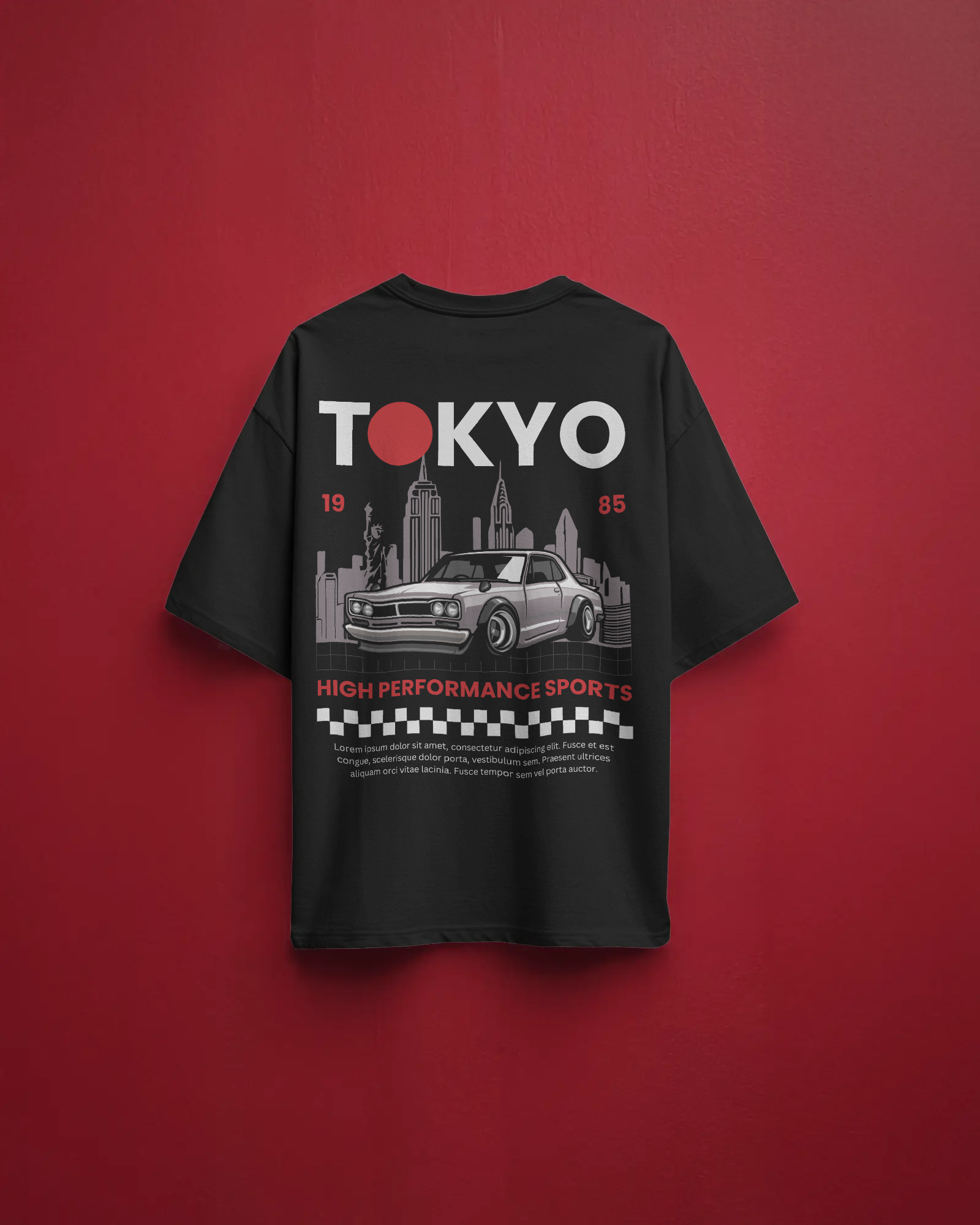 - Large back graphic featuring Tokyo skyline + classic JDM sports car